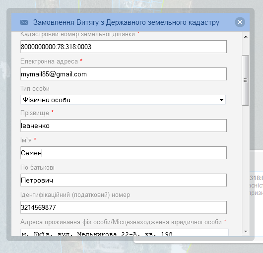 В формі необхідно вказати достовірні дані стосовно особи, що замовляє (та буде отримувати) Витяг з ДЗК.