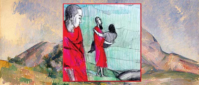 Огонь так сильно распространился, что если и попытаться, то спасти уже ничего невозможно. Поэтому он впадает в глубокую печаль. Его сын подбегает к нему и шепчет на ухо: